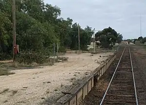 Strathmerton is a closed railway station on the Goulburn Valley railway in the town of Strathmerton, Victoria, Australia. The station opened at the same time as the railway from Shepparton to Cobram on 1 October 1888, with the line to Tocumwal not opening until 28 February 1905, ending at a temporary terminus on the south side of the Murray River,[1] the line not completed into Tocumwal until July 1908.[2] The junction between the lines was to the north of the station, facing down trains.
