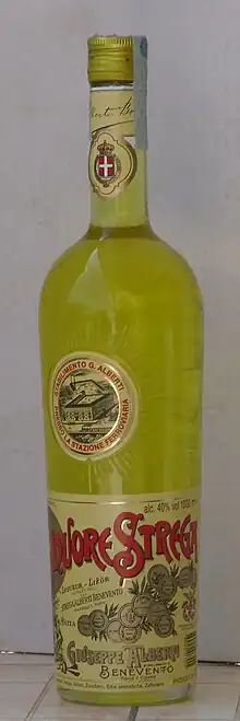 Liquore Strega is an Italian herbal liqueur produced since 1860 by the Strega Alberti Benevento s.p.a. in Benevento, Italy. Its distinctive yellow color comes from the presence of saffron. Strega is bottled at 80 proof (40% ABV), which is an alcohol content comparable to most hard liquors, but it has a sweetness and viscosity typical of liqueurs. Among its approximately 70 herbal ingredients are mint and fennel, giving it a complex flavor with minty and coniferous notes.