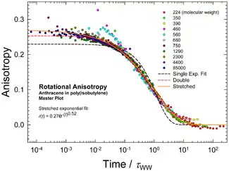 Figure 1. Illustration of a stretched exponential fit (with β=0.52) to an empirical master curve. For comparison, a least squares single and a double exponential fit are also shown. The data are rotational anisotropy of anthracene in polyisobutylene of several molecular masses. The plots have been made to overlap by dividing time (t) by the respective characteristic time constant.