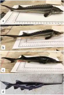 The sturddlefish is a hybrid of the American paddlefish (Polyodon spathula) and the Russian sturgeon (Acipenser gueldenstaedtii), accidentally created by researchers in 2019 and announced in 2020.[2] Obtaining living hybrids through breeding individuals from different families is unusual, especially given that the two species' last common ancestor lived 184 million years ago.[3] The hybrids were created accidentally during attempts to induce gynogenesis, a type of parthenogenic reproduction where a sperm cell must be present to trigger embryogenesis but does not genetically contribute to the offspring. Hundreds of hybrid fish were created, of which about two-thirds survived over one month, and about 100 survived for one year.[3] As of July 2020, all living hybrid fish are living in captivity at the research lab in Hungary.[4] There are no current plans to create new sturddlefish.[3]