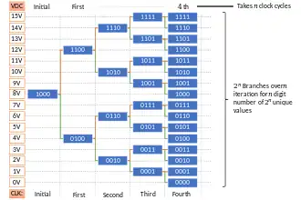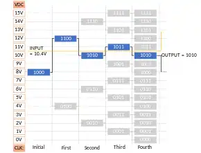2. In n-th clock cycle, if voltage is higher than digital equivalent voltage of the number in register, the (n+1)-th digit from the left is set to 1. If the voltage were lower than digital equivalent voltage, then n-th digit from left is set to zero and the next digit is set to 1. To perform a conversion, an N-bit ADC requires N such clock cycles excluding the initial state.
