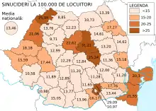 Since 2000, suicides rates have steadily declined in the country. According to the World Bank, the suicide mortality rate has dropped from 13.2 per 100,000 in 2000, to 10.4 per 100,000 in 2016.[3] Research conducted by the World Health Organization found that Romania had the 103rd highest rate of suicide in the world, on par with China.[4]
