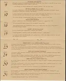 The festival took place in the months of July and August. There were two performances weekly, Friday and Saturday nights, solely dedicated to chamber music, modern dance, drama, poetry readings, and film. Admission was $2.00 per concert.