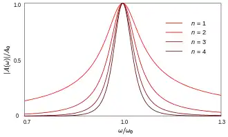 Plot showing the reduction of bandwidth caused by synchronous tuning with increasing number of stages, n. The Q of each stage is 10 in this example.
