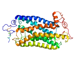 Tachykinin NK1 receptor[9] consists of 407 amino acid residues, and it has a molecular weight of 58,000.[6][10] NK1 receptor, as well as the other tachykinin receptors, is made of seven hydrophobic transmembrane (TM) domains with three extracellular and three intracellular loops, an amino-terminus and a cytoplasmic carboxy-terminus. The loops have functional sites, including two cysteines amino acids for a disulfide bridge, Asp-Arg-Tyr, which is responsible for association with arrestin and, Lys/Arg-Lys/Arg-X-X-Lys/Arg, which interacts with G-proteins.[9][10] The binding site for substance P and other agonists and antagonists is found between the second and third transmembrane domains. The NK-1 receptor is found on human chromosome 2 and is located on the cell's surface as a cytoplasmic receptor.[11]