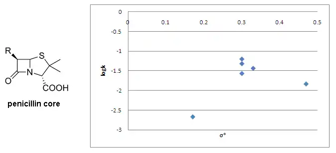 The Taft equation is often employed in biological chemistry and medicinal chemistry for the development of quantitative structure–activity relationships (QSARs). In a recent example, Sandri and co-workers[13] have used Taft plots in studies of polar effects in the aminolysis of β-lactams. They have looked at the binding of β-lactams to a poly(ethyleneimine) polymer, which functions as a simple mimic for human serum albumin (HSA). The formation of a covalent bond between penicillins and HSA as a result of aminolysis with lysine residues is believed to be involved in penicillin allergies. As a part of their mechanistic studies Sandri and co-workers plotted the rate of aminolysis versus calculated σ* values for 6 penicillins and found no correlation, suggesting that the rate is influenced by other effects in addition to polar and steric effects.