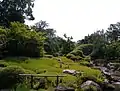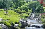 A new pond garden, or yoko-en, was designed by Kinsaku Nakane in 1963–1966. The new garden is large enough for visitors to walk in, and contains azaleas and a stream that cascades along the main axis, directly toward the main viewing position. The stream flows around rocks, gradually widening until it empties into a pool in front of the viewer.