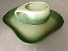 The irregularly-shaped glazed earthenware pottery was designed by Marjorie Tate, Leonard Tate, Betty Macaulay and Allen Macaulay. It has been exhibited in several museum exhibitions, including the Vital Forms: American Art and Design in the Atomic Age 1940–1960 show at the Brooklyn Museum[3] and the Hot Cars, High Fashion, Cool Stuff. Designs of the 20th Century exhibition at the Dallas Museum of Art. Tamac produced pieces in several glaze colors of which avocado green with dark green airbrushed trim is the most common; other colors include gray, raspberry, "butterscotch" (yellow), and the frosty line consisting of three colors: "frosty pine", "frosty fudge, and "frosty pink" with white trim. The biomorphic-shaped dinnerware included dishes, bowls, cup and saucers and serving vessels, as well as vases, candle holders and other accessories, such as decorative "wall pockets".[4][5] Several department stores in the region carried the Tamac line of tableware.[6]