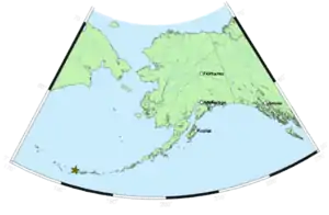 Tanaga Island (Aleut: Tanax̂ax;[2] Russian: остров Танага) is an island in the western Andreanof Islands, in the southwest part of the Aleutian Islands, Alaska. The island has a land area of 204 square miles (528 square kilometres), making it the 33rd largest oceanic island in the United States. Its highest point is volcano Mount Tanaga (Aleut: Kusuuginax̂[2]) at 5,925 feet (1,806 metres).
