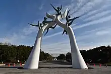 During his trip to Mexico in 1967, Okamoto painted a 5.5 x 30-meter mural in oil on canvas, entitled Asu no shinwa ("Myth of Tomorrow"), for the Hotel de Mexico in Mexico city by Manuel Suarez y Suarez that was being constructed for the 1968 Olympics.[26] The mural's subtitle is “Hiroshima and Nagasaki,” and accordingly the painting illustrates a landscape of nuclear destruction where a skeleton burns in red and emits pointed white protrusions. Surrounding images allude to events of nuclear disaster, such as the incident with Lucky Dragon #5.[27] The hotel was never completed and thus the mural was never installed or displayed. After being lost for 30 years in Mexico, on November 17, 2008, the mural was unveiled in its new permanent location at Shibuya Station, Tokyo.[28]