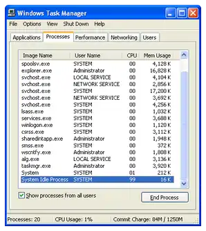 A Close Program dialog box comes up when Ctrl+Alt+Delete is pressed in Windows 9x.[2] Also, in Windows 9x, there is a program called Tasks (TASKMAN.EXE) located in the Windows directory. It is rudimentary and has fewer features. The System Monitor utility in Windows 9x contains process and network monitoring functionality similar to that of the Windows Task Manager. Also, the Tasks program is called by clicking twice on the desktop if Explorer process is down.
