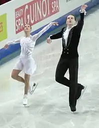 Volosozhar/Trankov began the 2011–12 season with wins at their two September competitions, the 2011 Nebelhorn Trophy and the 2011 Ondrej Nepela Memorial. Trankov partly tore a groin tendon at the Nepela Memorial.[25] On the Grand Prix series, the pair won Skate Canada with a combined score of 201.38 points and then won the 2011 Trophée Eric Bompard to qualify for the Grand Prix Final.[26] Trankov's inguinal rings (groin) injury caused them to change a pair spin at the Grand Prix Final.[27] Volosozhar/Trankov were the leaders after the short program but placed second to Savchenko/Szolkowy in the free skate and were awarded the silver medal — only 0.18 of a point separating the two teams at the end of the competition. At the post-event press conference, they said they would miss Russian Nationals in order to recover fully from their injuries.[25][28]