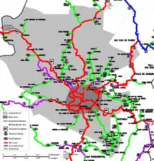 Tegucigalpa's infrastructure has not kept up with its population growth.[34] Deficient urban planning,[35] densely condensed urbanization, and poverty[36] are ongoing problems.[37] Heavily congested roadways, where road infrastructure is unable to efficiently handle over 400,000 vehicles, create havoc on a daily basis.[38] Both national and local governments have taken steps to improve and expand infrastructure as well as to reduce poverty in the city.[39][40]