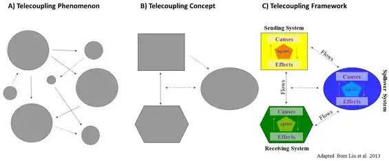 Telecoupling is a strategy that comprehensively analyzes both the socioeconomic and environmental impacts over long distances. The concept of telecoupling is a logical extension of research on coupled human and natural systems, in which interactions occur within particular geographic locations.[1][2] The telecoupling framework derives from the understanding that all land systems are connected through coupled human and natural systems,[3] and these that social, ecological, and economic impacts are the result. The term telecoupling was first coined by Jianguo Liu as an evolution of the term teleconnection. While teleconnection makes reference to atmospheric sciences only, telecoupling references the integration of multiple scientific disciplines including social science, environmental science, natural science, and systems science.[2] The integration of these dynamic fields of science is what allows the telecoupling framework to comprehensively analyze distal connections that have been previously understudied and unacknowledged.