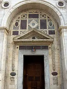 The church is immediately recognizable from its wide marble façade, decorated by sculptures probably made by Agostino di Duccio and Matteo de' Pasti. Alberti aspired to renew and rival the Roman structures of antiquity, though here his inspiration was drawn from the triumphal arch,[2] in which his main inspiration was the tripartite Arch of Constantine in Rome. But as Rudolf Wittkower remarked,[3] he drew details (the base, the half-columns, the discs, moldings) from the Arch of Augustus. The large arcades on the sides are reminiscent of the Roman aqueducts. In each blind arch is a sarcophagus, a gothic tradition of interment under the exterior side arches of a church.[4]