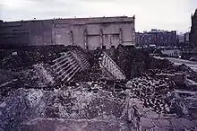 The Templo Mayor (English: Main Temple) was the main temple of the Mexica people in their capital city of Tenochtitlan, which is now Mexico City. Its architectural style belongs to the late Postclassic period of Mesoamerica. The temple was called Huēyi Teōcalli [we:ˈi teoːˈkali][1] in the Nahuatl language. It was dedicated simultaneously to Huitzilopochtli, god of war, and Tlaloc, god of rain and agriculture, each of which had a shrine at the top of the pyramid with separate staircases. The central spire was devoted to Quetzalcoatl in his form as the wind god, Ehecatl.[2] The Great Temple devoted to Huitzilopochtli and Tlaloc, measuring approximately 100 by 80 m (328 by 262 ft) at its base, dominated the Sacred Precinct.[3] Construction of the first temple began sometime after 1325, and it was rebuilt six times. The temple was destroyed by the Spanish in 1521, and the Mexico City cathedral was built in its place.[4]