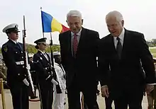 Robert Gates, the United States Defense Secretary (right) escorts Teodor Meleșcanu through an honor cordon into the Pentagon, to talk about bilateral defense issues (September 24, 2008)
