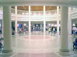 Its main attraction is The American Adventure show. The lobby is a square room that has an oval-shaped area in the middle with a dome-shaped ceiling. The walls contain quotes from famous Americans, which include Walt Disney and Charles Lindbergh, and paintings of American life throughout history representing what America is all about. The Hall of Flags exhibit is a display of the different flags throughout U.S. history that you see as you go upstairs to the theater. In the upstairs lobby there are two more paintings of American life. In the theater, there are 12 statues, six on each side of the theater, that are spirits of American values personified.