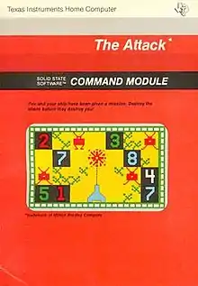 The Attack is a multidirectional shooter video game created, designed, and implemented by Jim Pettingell for the TI-99/4A home computer and published by Texas Instruments in 1981.[1] The game was developed at Milton Bradley as Alien Attack, inspired by the movies Alien (1979) and Barbarella (1968). After being sold to TI, the name was changed to The Attack.[2]