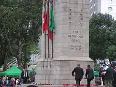 The Cenotaph was unveiled on 24 May 1923 (Empire Day) by the then Governor Sir Reginald Edward Stubbs.[3] At that time, the location was still on the waterfront. Initially built to commemorate the dead of the First World War,[4] inscribed with the words "The Glorious Dead", the dates 1939–1945 were added later to honour victims of the Second World War, and the Chinese characters 英魂不朽 浩氣長存 ("May their martyred souls be immortal, and their noble spirits endure") were added in the 1970s to commemorate those who lost their lives during the Japanese invasion.[1]