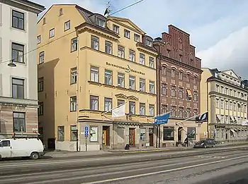 In the corner towards Pelikansgränd (marked as I on the map) lies an older plastered house with a painted socle. The current old-fashioned facade is primarily a work from 1967 when the house was under renovation, even though the portal is older. The building had a rusticated facade in the beginning of the 20th century.