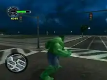The Incredible Hulk: Ultimate Destruction is a third-person action-adventure game in which the player controls the Hulk, the super-powered alter-ego of scientist Bruce Banner. Influenced by hypnotic suggestions from Banner's psychotherapist Leonard Samson, the Hulk is tasked with gathering resources for a machine that will cure Banner of the infliction that causes his transformations into the Hulk.[1] Between each story-based mission, the Hulk can freely explore the game's open world as well as engage in side missions such as playing rounds of golf with giant balls and clubs or carrying an ambulance to a hospital.[1][2] His location in the world is tracked by a radar on the bottom-left corner of the screen,[3] and a variety of icons on the radar indicate mission objectives; for example, a red fist indicates something that must be destroyed, while a blue shield indicates something that must be protected. Samson's base is indicated by a green house icon.[1]