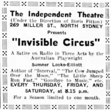 - ↑ "Repertory To Produce "Invisible Circus"". The Advertiser (Adelaide). Vol. 89, no. 27415. South Australia. 17 August 1946. p. 7. Retrieved 6 September 2023 – via National Library of Australia.