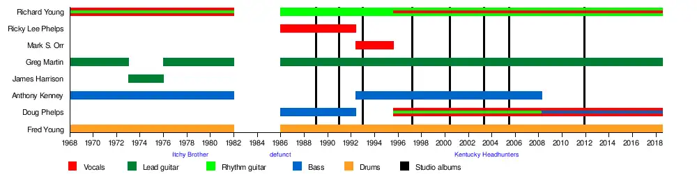 The Kentucky Headhunters are an American country rock and Southern rock band originating in the state of Kentucky. The band's members are Doug Phelps (vocals, bass guitar), Greg Martin (vocals, lead guitar), and brothers Richard Young (vocals, rhythm guitar) and Fred Young (vocals, drums). It was founded in 1968 as Itchy Brother, which consisted of the Young brothers and Martin, along with Anthony Kenney on bass guitar and vocals. Itchy Brother performed until 1982, with James Harrison replacing Martin from 1973 to 1976. The Youngs and Martin began performing as The Kentucky Headhunters in 1986, adding brothers Ricky Lee Phelps (lead vocals, harmonica) and Doug Phelps (bass guitar, vocals) to the membership.