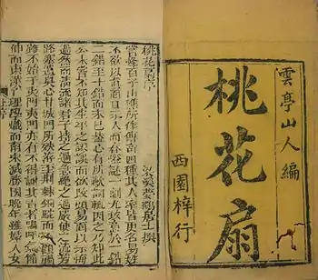 The Peach Blossom Fan (Chinese: 桃花扇; pinyin: Táohuā shàn; Wade–Giles: T'ao-hua shan; Jyutping: Tou4faa1 sin3) is a musical play and historical drama in 44 scenes that was completed in 1699 by the early Qing dynasty playwright Kong Shangren after more than 10 years of effort.[1][2]