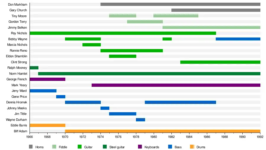 Saxophonist Don Markham, who had played with Sly & the Family Stone, the Ventures, the Bakersfield Brass, and Johnny Paycheck played with the Strangers from 1974 to 2013.[17] In the mid-1970s, former Bob Wills and the Texas Playboys guitarist Estel "Eldon" Shamblin was invited to join the Strangers.[18] After retiring from the Strangers, Eldon Shamblin would continue to perform with them whenever they played in Tulsa.[19] Electric mandolinist Billie "Tiny" Moore also joined the Strangers during the 1970s.[20] Like Eldon Shamblin, Tiny Moore had also been a member of Bob Wills and the Texas Playboys.[21]