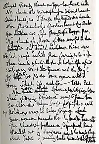 In a conversation with George Steevens, Johnson recounted that he wrote the first seventy lines "in the course of one morning, in that small house behind the church".[7] Johnson claimed that "The whole number was composed before I committed a single couplet to writing".[8] To accomplish this feat, Johnson relied on a "nearly oral form of composition" which was only possible "because of his extraordinary memory".[8] Johnson told Boswell that when he was writing poetry, he often "from laziness" only wrote down the first half of each line.[9] This remark is borne out by the manuscript of The Vanity of Human Wishes, in which the first half of each line is written in a different ink to the second half; "evidently Johnson knew that the rime words would keep the second halves in mind."[10] Although Johnson was busy after 1746 working on his Dictionary, he found time to further work on The Vanity of Human Wishes and complete his play, Irene.[11]