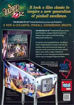 The Wizard of Oz is a Jersey Jack Pinball, Inc. pinball machine designed by Joe Balcer and released in April 2013. It is the first US pinball machine with an LCD in the back box as well as the first one to have color on the monitor produced in the US since the Pinball 2000 games.[1] Although it is not the first pinball machine with a LCD worldwide because MarsaPlay in Spain manufactured a remake of Inder's original Canasta titled New Canasta, with an LCD screen in the backbox in 2010.[2][3]