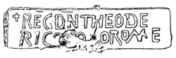 - ↑ Whether this is a coin at all or a medallion to be only worn around the neck is debated by historians, due to its weight, detail and thickness.[1] The Late Latin inscription of REX THEODERICVS PIVS PRINCIS also confounds, with "princis" possibly meaning, "princ[eps] i[nvictus] s[emper]" (roughly, 'ever-unconquered leader').[2] Note Germanic moustache and hairstyle, and possible elongated skull.