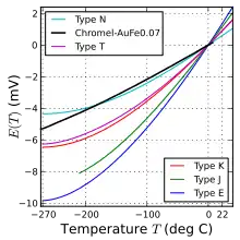 Type E (chromel–constantan) has a high output (68 μV/°C), which makes it well suited to cryogenic use. Additionally, it is non-magnetic. Wide range is −270 °C to +740 °C and narrow range is −110 °C to +140 °C.