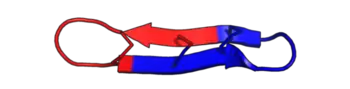 θ-defensins are cyclic peptides of 18 amino acids (~2 kDa), possessing antimicrobial activity against a range of Gram-positive and Gram-negative bacteria, fungi, and some retroviruses.[4][5][6][7] They consist of a pair of antiparallel β-sheets linked by three disulfide bonds arranged as a ladder along the sheets to form an extremely stable structure. Additionally, the peptides may self-associate into trimers.[8]