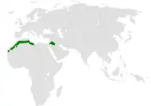 It is found in northern Africa from Mauritania and Morocco to Libya, also in central regions of the Arabian Peninsula. Its natural habitats are subtropical or tropical dry shrubland and hot deserts.