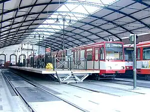 The former depot Thielenbruch for the tram network consisted of one hall from 1906 and another from 1926. The older hall was rebuilt to the terminal of the Stadtbahn lines. There are today two platforms of which each serve two tracks, so the station totally offers four tracks.[2]
