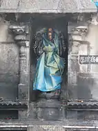 This temple is situated in Magaral, a village in Kanchipuram district, located 12 km from Uthiramerur on the Uthiramerur - Kanchipuram highway. The temple is located on the northern banks of Cheyyar River.[2] The nearest railway station is at Kanchipuram and the nearest airport is Chennai International Airport. The Shiva temple at Magaral is spread over an area of 2 acres (8,100 m2). The main rajagopuram is on the east side with seven tiers and pierces the large rectangular granite walls. The temple tank, Indra Theertha, is located inside the main entrance. The temple is built on an elevated platform and there are two corridors inside the temple. At the main entrance, the sculptures of Ganapathy and Muruga can be found on both the sides. The main shrine accommodates the image of Shiva known as Thirumakaraleeswarar in the form of Lingam, of the size of the tail of an iguana. There is a separate shrine for Balambigai to the right of Thirumakaraleeswarar's sanctum. The first precinct on the four sides of the sanctum sanctorum are decorated with the images of Nayanmars, Navagrahas, Bhairava, Murugan Sannadhi in the northwest and Durga Sannadhi on the northeast. The vimana of the temple is called Gajabrusta in model, replicating the hip of an elephant.[1]