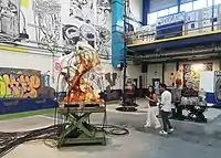 Feuerstein's work involves digital and biochemical processes and transmutations, with specific materialities playing a central role. Processes and materials are used both as carriers of meaning and narrations and in the form of materials, and ultimately become agents in art. Essential aspects are the interplay of linguistic, visual and molecular-processual elements, the detection of latent links between facts and fictions as well as the entanglement between art and science. Feuerstein developed the artistic method of "conceptual narration" for this purpose.[3] At the border between nature, art and science, Feuerstein's works set in motion pataphysical cycles of the production of meaning and possibilities. The works contain pataphysical references to Alfred Jarry, Raymond Roussel or Marcel Duchamp. In contrast to historical pataphysics, machines, apparatuses and scientific methods are not only attributed metaphorical and symbolic meanings, but used for real processes. Feuerstein speaks of "patachemistry" and "patabiology" in the context of projects involving biological organisms and processes.[4] Examples of this are metabolic processes in which artistic materials are produced, altered or digested in the form of objects and sculptures. References to aspects of entropy in Robert Smithson's work or to Robert Morris' form and anti-form can be found in works with biofilms, slime, fungi, and myxomycetes.[5] [6]