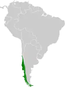 It is found in noisy flocks from central Chile and adjacent Argentina, south to Tierra del Fuego.[11] A study of the refugia used by rayaditos when the Patagonian Ice Sheet covered most of the species' existing range shows that Mocha Island was the most prominent glacial refuge and suggests the possibility that the species was present in areas to the east of the ice sheet in Argentine Patagonia, creating considerable gene flow when most of the ice sheet melted.[13]