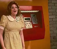• In one of the advertisements, a blonde woman that wore a red and white polka-dotted dress sang "I'm Tillie the All-Time Teller, I work for First National Bank" while standing beside the machine.