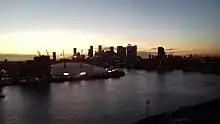 A view of the O2 Arena, Canary Wharf, and the Thames at twilight in November 2020. Taken from the IFS Cloud Cable Car, which at the time was sponsored by Emirates Airline.