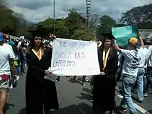 Graduates with a sign saying: "What use do I have of two careers in a dictatorship?".