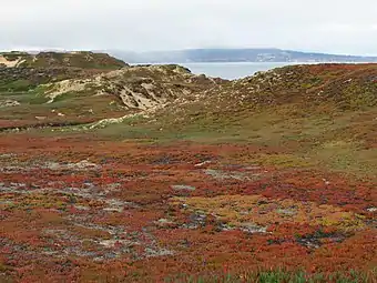 View from the coastal sand dunes of Fort Ord, looking southwest toward Monterey - 2–3 – The main camp remained in place while Captain Rivera took 8 soldiers to explore the Monterey Peninsula and farther south, seeing mouth of the Carmel River at today's Carmel River State Beach. They returned on the 3rd, still failing to recognize either Monterey harbor or the Carmel River as the places named and described by Vizcaíno.