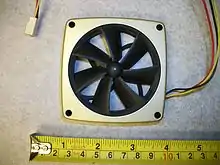 TMD moves the motor out of the hub of the fan and puts it around the edge. The impeller blades are surrounded by a ring studded of twelve magnets which are acted upon by four coils located in the corners of the frame.