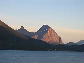 Tjongsfjorden is a fjord, located in the municipality of Rødøy, which is located in Nordland county, of western Norway. The 17-kilometre (11 mi) long fjord begins just west of the Svartisen glacier; it flows west and flows into the Rødøyfjorden, which is just east of the island of Rødøya. The mountain, Blokktinden, lies on the southern shore. The village, Tjong and Vågaholmen, lie along the northern shore. Norwegian County Road 17, running across Nordland and Trøndelag, runs along the inner part of the fjord.[1]