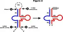 Most tmRNAs are transcribed as larger precursors which are processed much like tRNA. Cleavage at the 5´ end is by ribonuclease P.[4] Multiple exonucleases can participate in the processing of the 3´ end of tmRNA, although RNase T and RNase PH are most effective.[14][15] Depending on the bacterial species, the 3'-CCA is either encoded or added by tRNA nucleotidyltransferase.