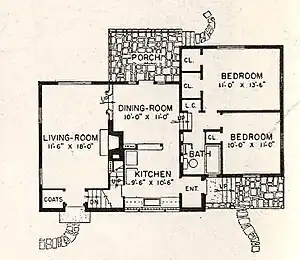 He established an office at the corner of 15th Avenue and High Street and named his firm Todd Tibbals and Associates. Tibbals and his associate Noverre Musson both won Architects Society of Ohio awards in 1942 for private residences they designed.[2] Musson was a fellow Ohio State Graduate, and had studied for two years under Frank Lloyd Wright.[3][4] Other members of the firm included Wilmer Nieb, Arthur Dupre, Charles W. Lewis and Mary Garrison. Nieb and Dupre were architects, Lewis supervised construction and Garrison designed interior blandishments.[2]