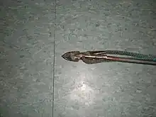 The toggling harpoon is an ancient weapon and tool used in whaling to impale a whale when thrown. Unlike earlier harpoon versions which had only one point, a toggling harpoon has a two-part point. One half of the point is firmly attached to the thrusting base, while the other half of the point is fitted over this first point like a cap and attached to the rest of the point with sinew or another string-like material. When the harpoon is thrust into an animal, the top half of the point detaches and twists horizontally into the animal under the skin, allowing hunters to haul the animal to ship or shore. This harpoon technology lodges the toggling head of the harpoon underneath both the animal's skin and blubber, and instead lodges the point in the muscle, which also prevents the harpoon slipping out.