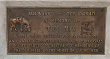 For his contribution to the motion picture industry, Mix has a star on the Hollywood Walk of Fame at 1708 Vine Street. His cowboy boot prints, palm prints and the hoof prints of his horse, Tony, are at Grauman's Chinese Theatre, at 6925 Hollywood Boulevard. In 1958 Mix was inducted posthumously into the Western Performers Hall of Fame at the National Cowboy & Western Heritage Museum in Oklahoma City, Oklahoma. In 1959, a "Monument to the Stars" was erected on Beverly Drive (where it intersects Olympic Boulevard and becomes Beverwil) in Beverly Hills. The memorial consists of a bronze-green spiral of sprocketed "camera film" above a multi-sided tower, embossed with full-length likenesses of early stars who appeared in famous silent movies. Those memorialized include Douglas Fairbanks, Mary Pickford, Will Rogers, Conrad Nagel, Rudolph Valentino, Fred Niblo, Harold Lloyd, and Mix. There is also a Tom Mix museum in Dewey, Oklahoma.[19][20] Additionally, from 1986 to 2002 there existed another museum in his birthplace of Mix Run, Pennsylvania.[21] Between 1980 and 2004, 21 Tom Mix festivals were held during the month of September, most of them in DuBois, Pennsylvania.